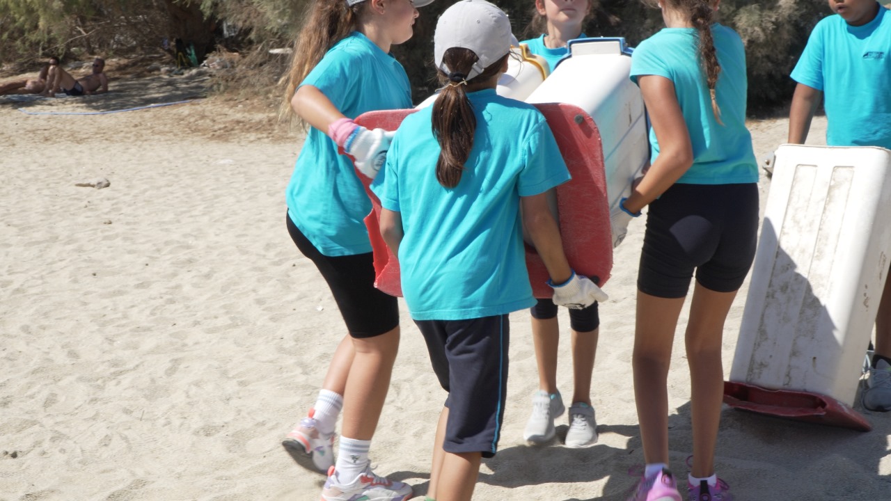 Later, together with 50 sixth-grade students, we went to Kalafatis Beach, where we collected a total of 55 kilos of waste from the sea and the shore. Among the items found were a car tire, inflatable mattresses, clothes and fabrics. The children were also surprised to discover a cigar, fishing gear, and many aluminum soda cans. Most striking of all, however, was the collection of approximately 550 cigarette butts, which sparked an important discussion about everyday habits and their impact on the environment.